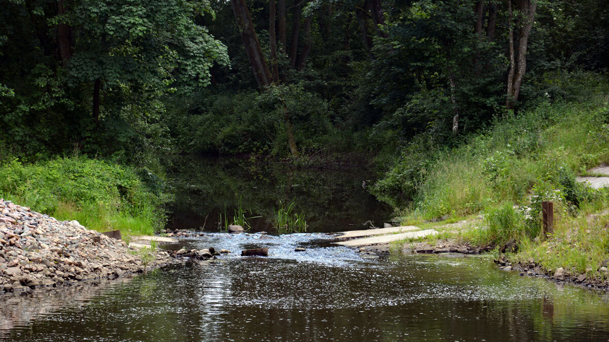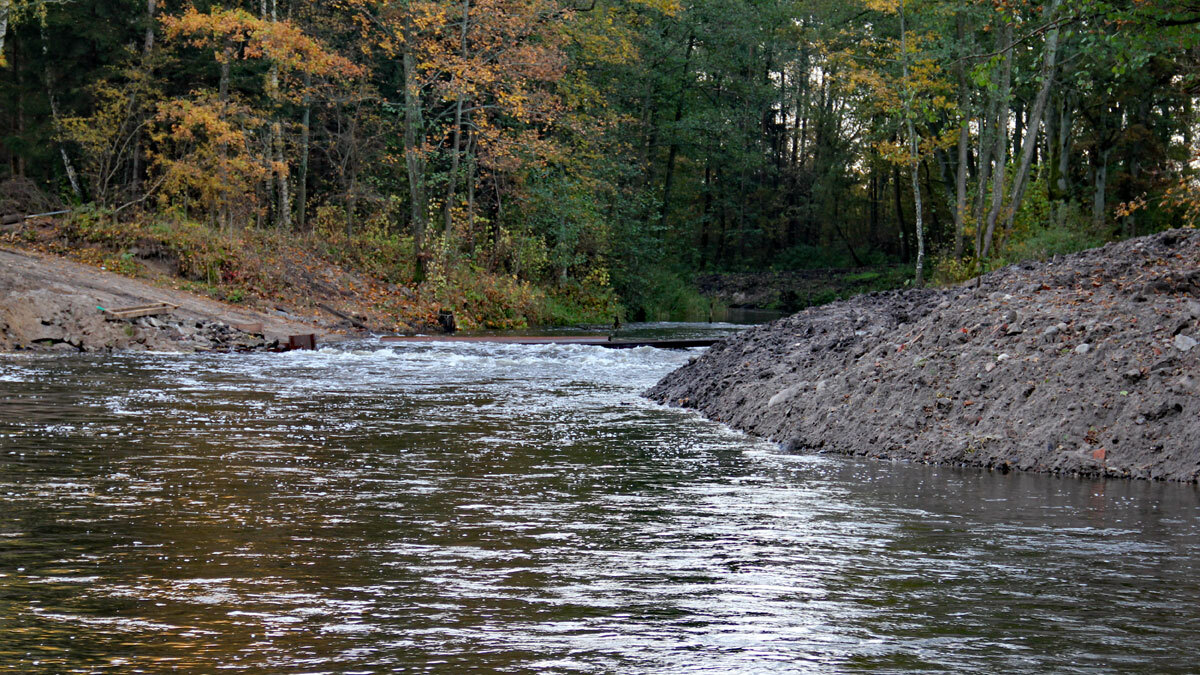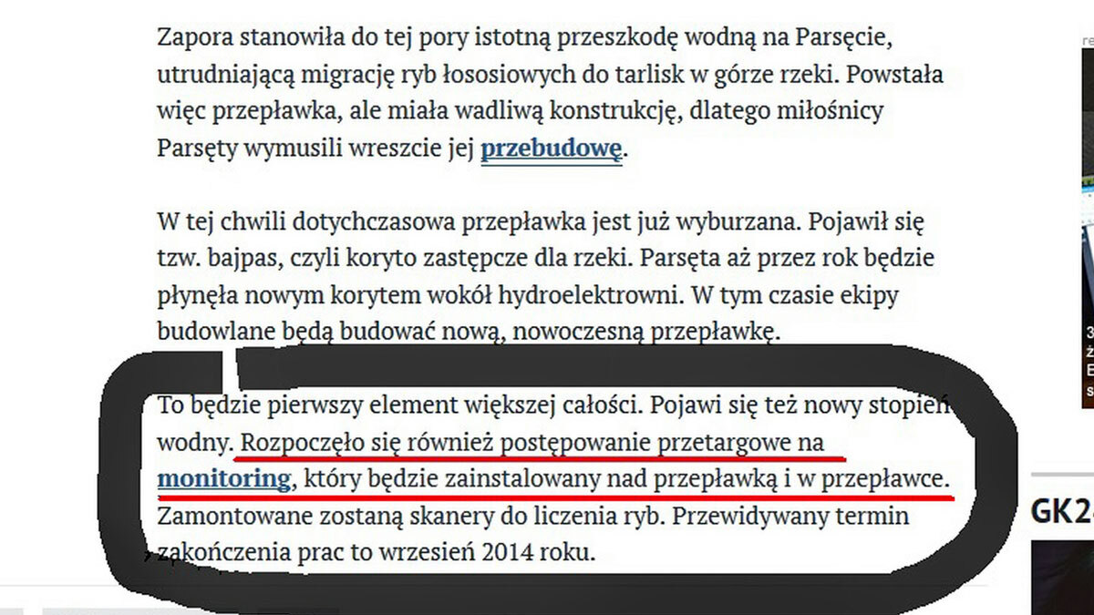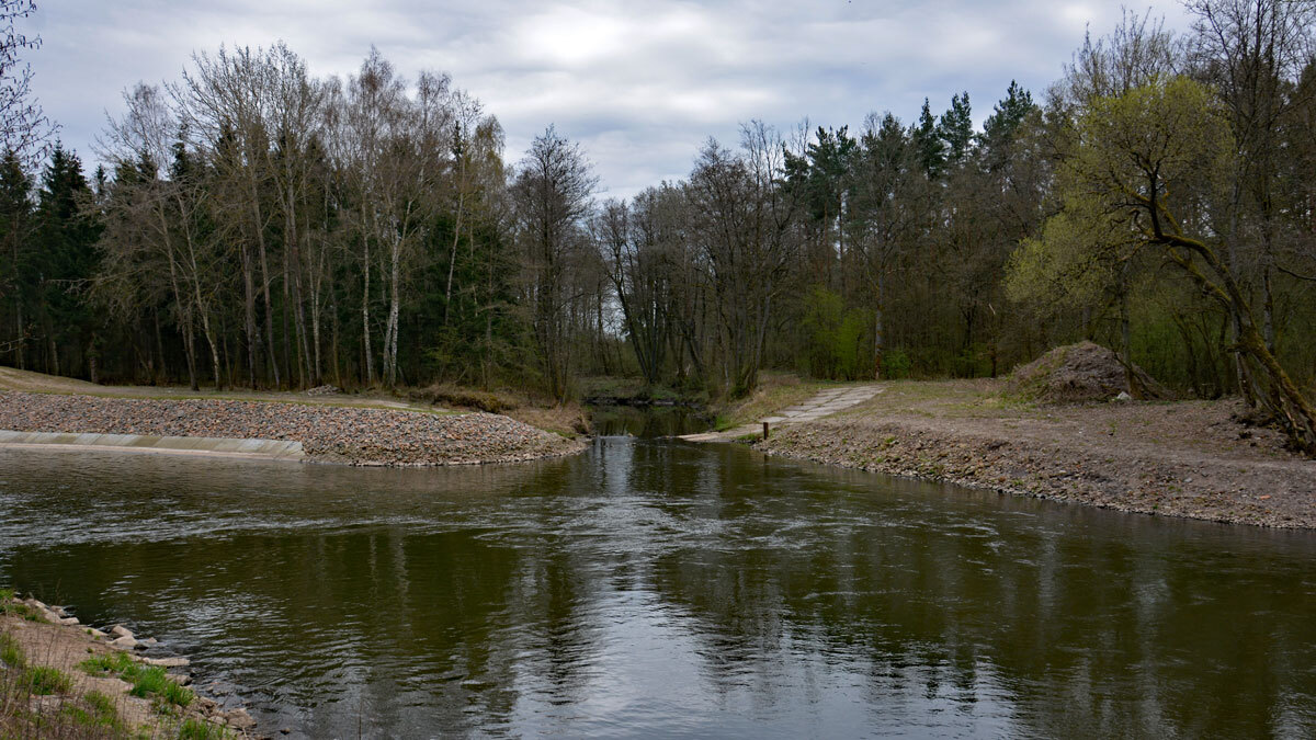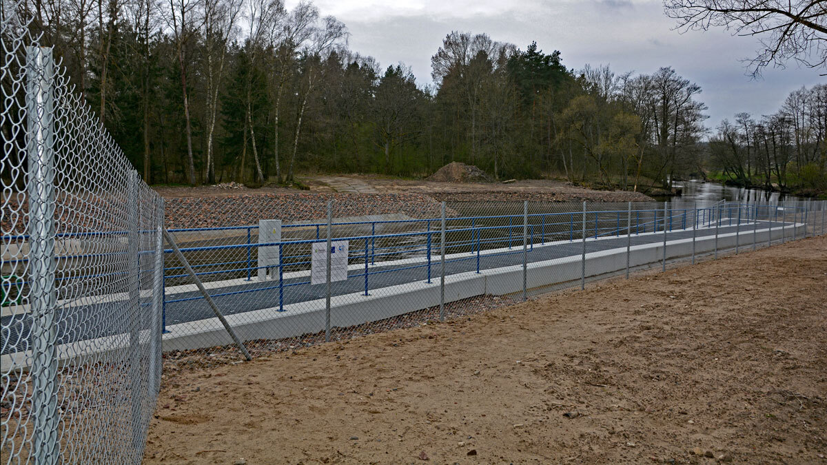umieszczenie w nurcie ogromnych głazów zaporowych i wypełnienie dna materiałem żwirowo-kamiennym o różnorodnej granulacji utworzono tarlisko sztuczne. Przy niskiej wodzie wygląda nieźle, ale czy i jak dalece szlachetne ryby zechcą z niego korzystać przy tak dalece zmienionym i zmiennym przepływie wody - jeszcze konkretnie nie stwierdzono. Przy wodzie wysokiej, gdy przed zaporą nad wlotami do przepustów tworzą się potężne wiry a z wylotów „zwężki” woda wypływa w gwałtownym, szalonym pędzie, nie sposób uwierzyć, że jakakolwiek ryba zdoła taką przeszkodę bezpiecznie pokonać zarówno w wędrówce w górę rzeki, jak i po tarle w dół.